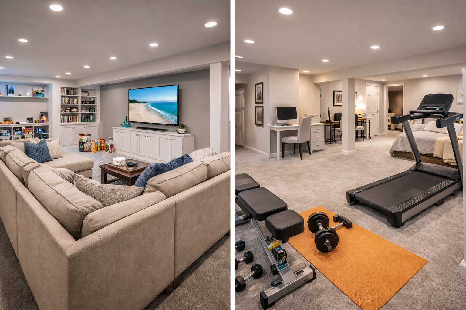 Basements often require planning around beams, ductwork, and utilities. The goal is to build zones: storage, living area, office/gym, and clean access to mechanicals.
